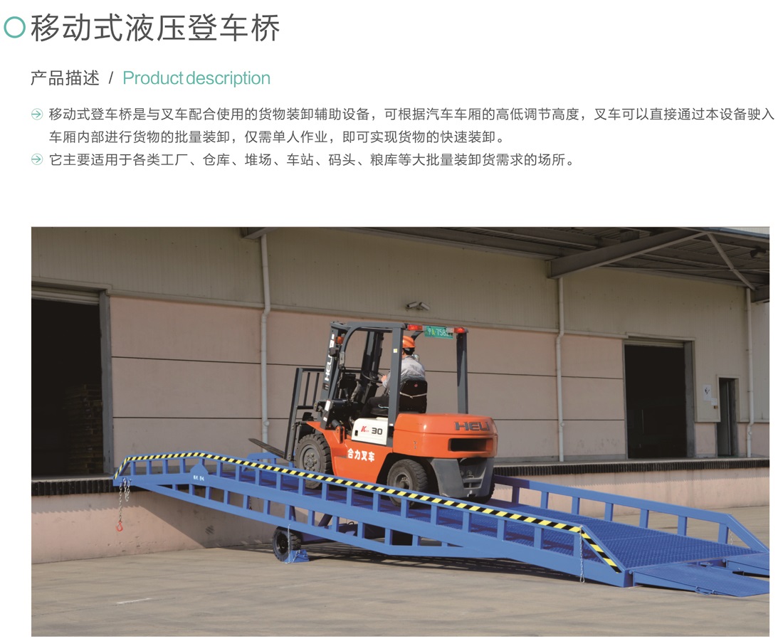 移動式登車橋是與叉車配合使用的貨物裝卸輔助設(shè)備,可根據(jù)汽車車廂的高低調(diào)節(jié)高度,叉車可以直接通過本設(shè)備駛?cè)胲噹麅?nèi)部進行貨物的批量裝卸,僅需單人作業(yè),即可實現(xiàn)貨物的快速裝卸。