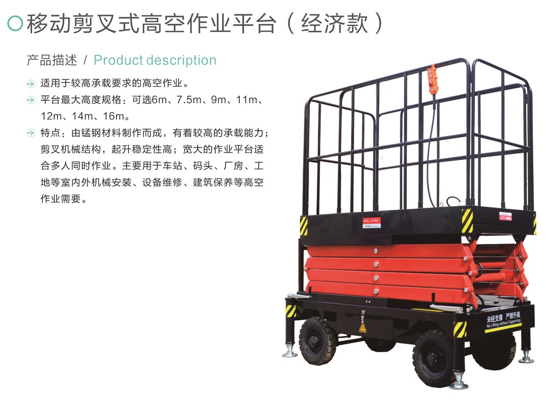 特點:由錳鋼材料制作而成,有著較高的承載能力;剪叉機(jī)械結(jié)構(gòu),起升穩(wěn)定性高;寬大的作業(yè)平臺適合多人同時作業(yè)。主要用于車站、碼頭、廠房、工地等室內(nèi)外機(jī)械安裝、設(shè)備維修、建筑保養(yǎng)等高空