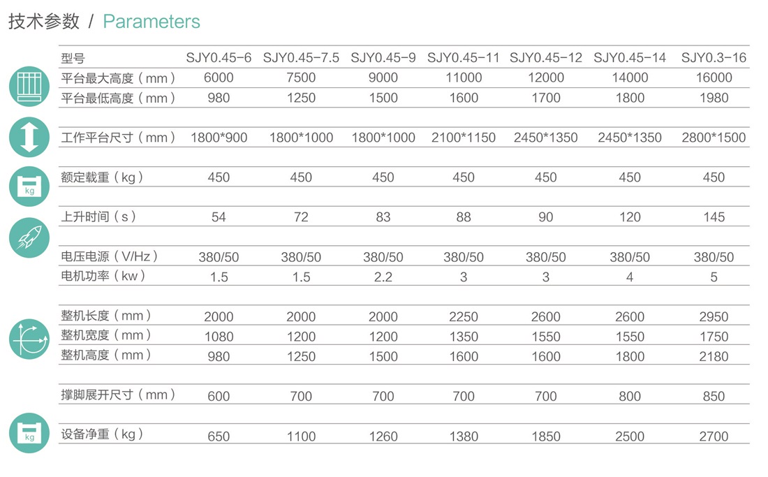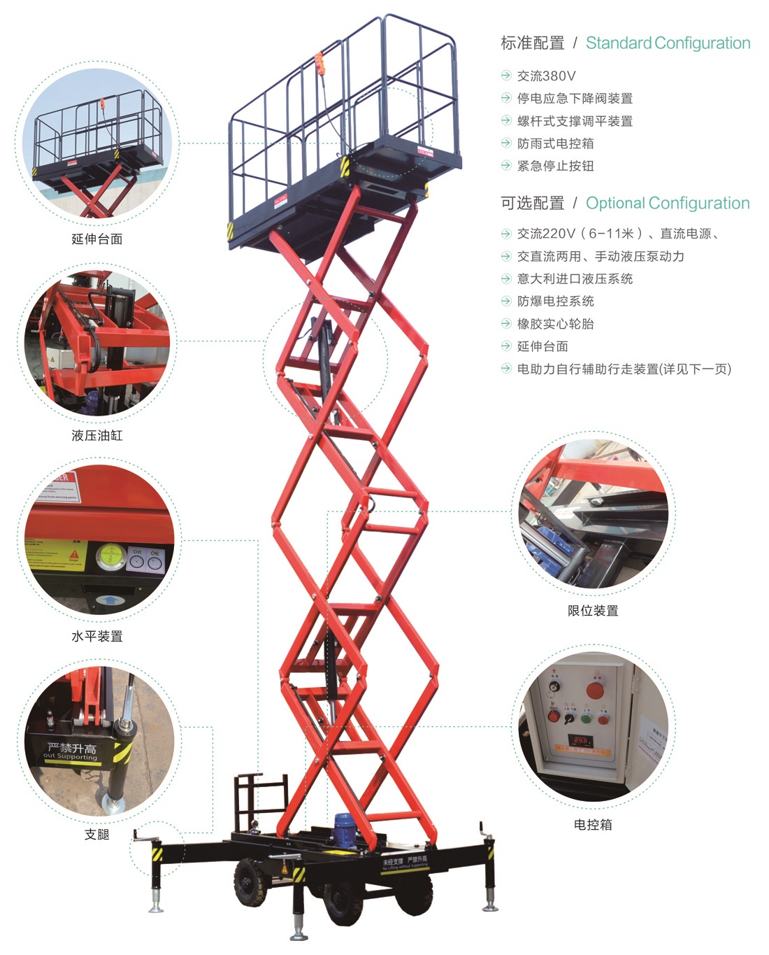 平臺最大高度規(guī)格:可選6m、7.5m、9m、11m、12m、14m、16m。