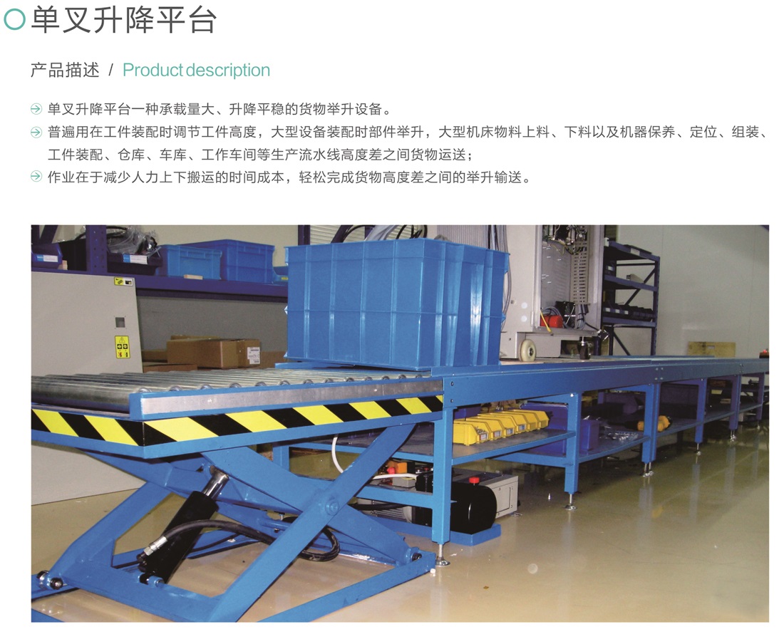 單叉升降平臺(tái)一種承載量大、升降平穩(wěn)的貨物舉升設(shè)備。普遍用在工件裝配時(shí)調(diào)節(jié)工件高度,大型設(shè)備裝配時(shí)部件舉升,大型機(jī)床物料上料、下料以及機(jī)器保養(yǎng)、定位、組裝、工件裝配、倉庫、車庫、工作車間等生產(chǎn)流水線高度差之間貨物運(yùn)送;作業(yè)在于減少人力上下搬運(yùn)的時(shí)間成本,輕松完成貨物高度差之間的舉升輸送。