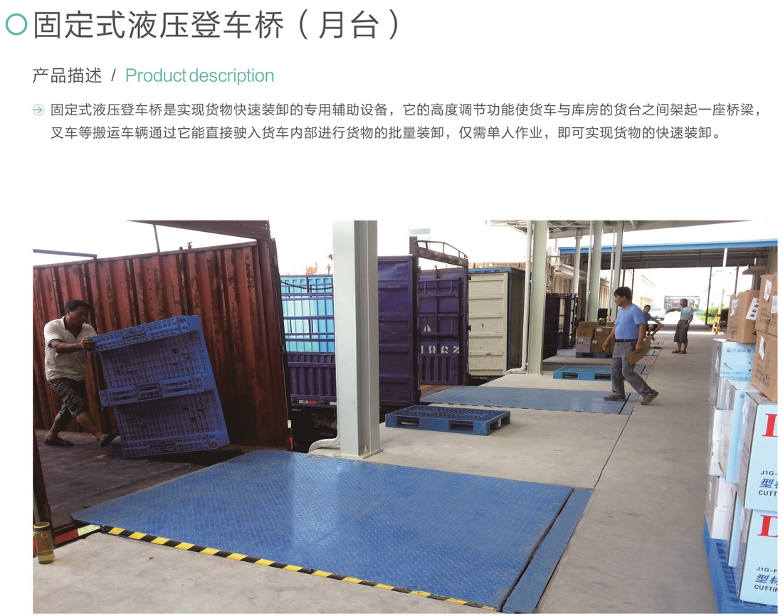 固定式液壓登車橋是實現(xiàn)貨物快速裝卸的專用輔助設備,它的高度調(diào)節(jié)功能使貨車與庫房的貨臺之間架起一座橋梁,叉車等搬運車輛通過它能直接駛入貨車內(nèi)部進行貨物的批量裝卸,僅需單人作業(yè),即可實現(xiàn)貨物的快速裝卸。